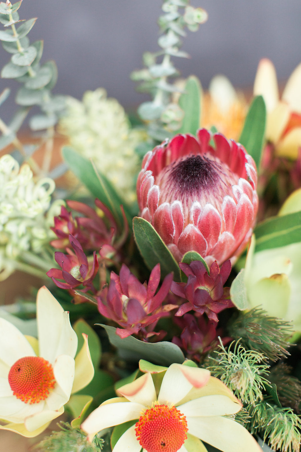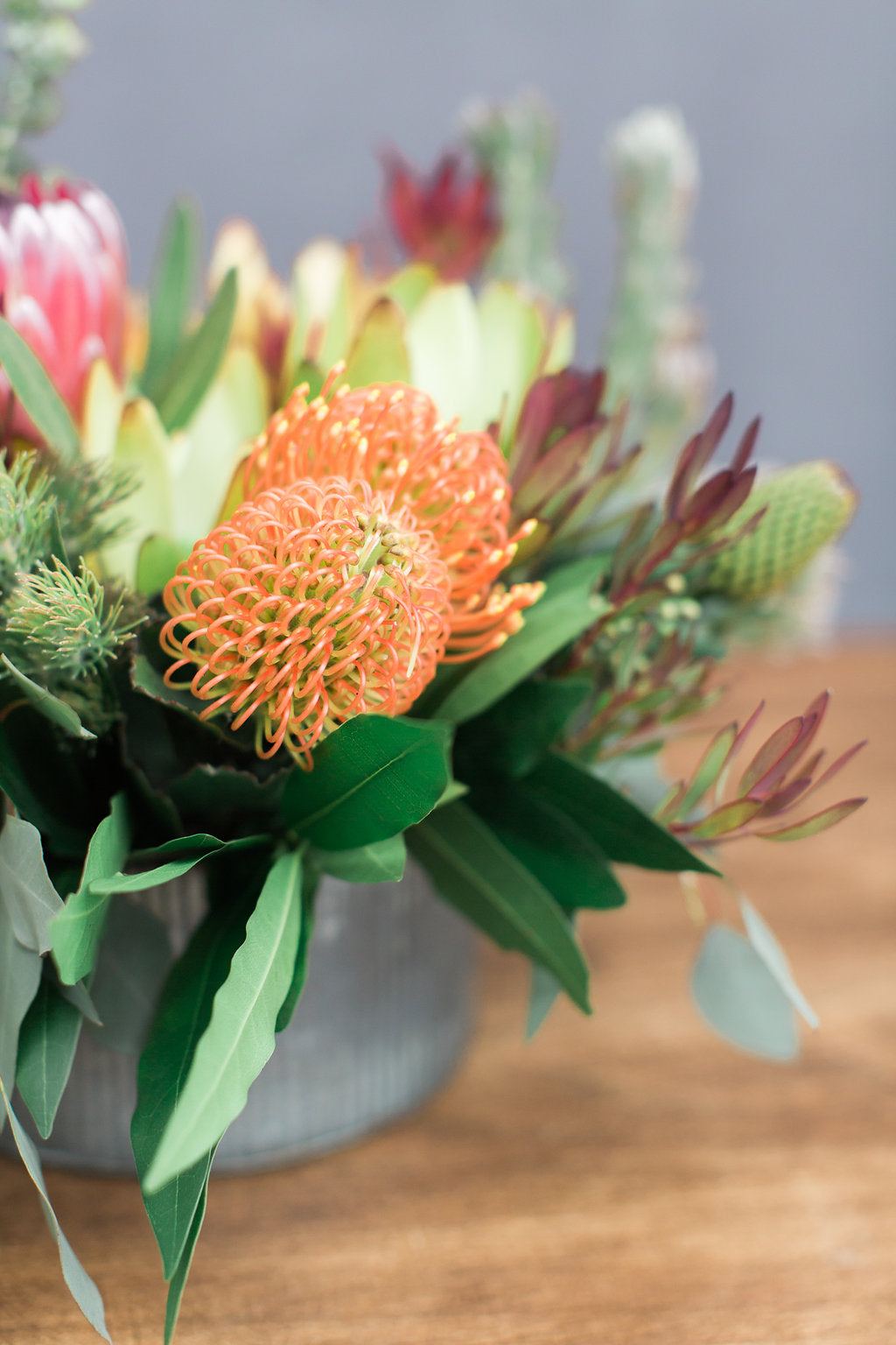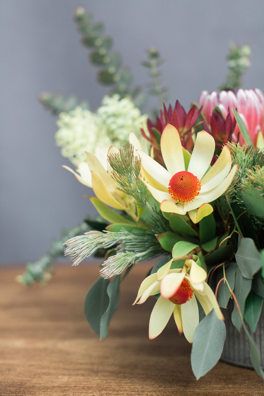 The Big Sur Centerpiece is a mixture of our favorite locally grown protea and greenery in a unique corrugated metal container.